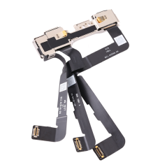 Elle regroupe la caméra frontale, le capteur de luminosité et de proximité, ainsi que le micro secondaire utilisés pour FaceTime et la réduction de bruit.